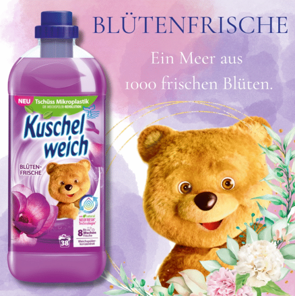 „Kuschelweich Bluten Frische“ drabužių minkštiklis suteikia skalbiniams ypatingo švelnumo ir ilgalaikį gaivos pojūtį. Unikalus aromatas su gaiviu, lengvu kvapu išsilaiko iki 8 savaičių dėka NeoFresh® technologijos. Koncentruota formulė užtikrina, kad buteliuko užteks net 38 skalbimams. Be mikroplastiko, draugiškas tiek odai, tiek aplinkai.