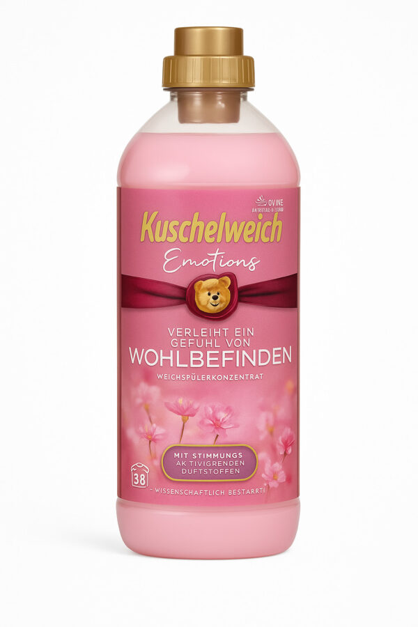 „Kuschelweich Emotions Wohlbefinden“ drabužių minkštiklis sukurtas tam, kad suteiktų ne tik švelnumo jūsų skalbiniams, bet ir jaukumo bei geros savijautos pojūtį. Jo aromatas papildytas specialiomis nuotaiką aktyvuojančiomis kvapiosiomis medžiagomis, kurios sukuria malonią, harmoningą atmosferą. Buteliuko pakanka 38 skalbimams. Sudėtyje nėra mikroplastiko, todėl jis draugiškas aplinkai.