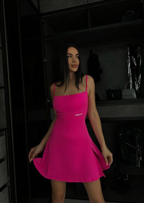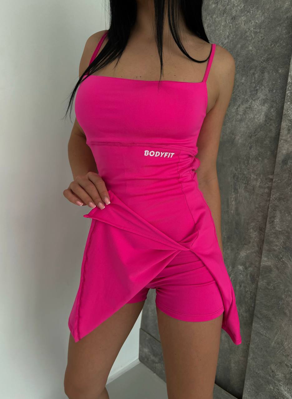Ryški, figūrą pabrėžianti sportinė suknelė su paslėptais šortais – tobulas derinys aktyviam laisvalaikiui ar pasivaikščiojimams mieste. Suknelėje integruotos nuimamos krūtinės kaušeliai, todėl nereikia papildomo liemenėlio. Nugaroje – stilingi iškirpimai, o priekyje – kokybiškas užrašas „BODYFIT“.