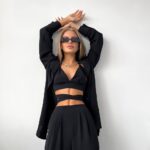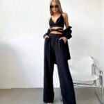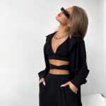Stilingas ir universalus trijų dalių kostiumas – idealus pasirinkimas šiuolaikinei moteriai! Komplektą sudaro laisvo kritimo marškiniai, aukštu liemeniu kelnės ir korsetinė palaidinė su dekoratyviniu perrišimu. Audinys malonus kūnui, modelis nevaržo judesių, o spalvų paletė leidžia rinktis pagal nuotaiką. Šis derinys tinka tiek kasdieniam miesto stiliui, tiek vakariniam išėjimui.