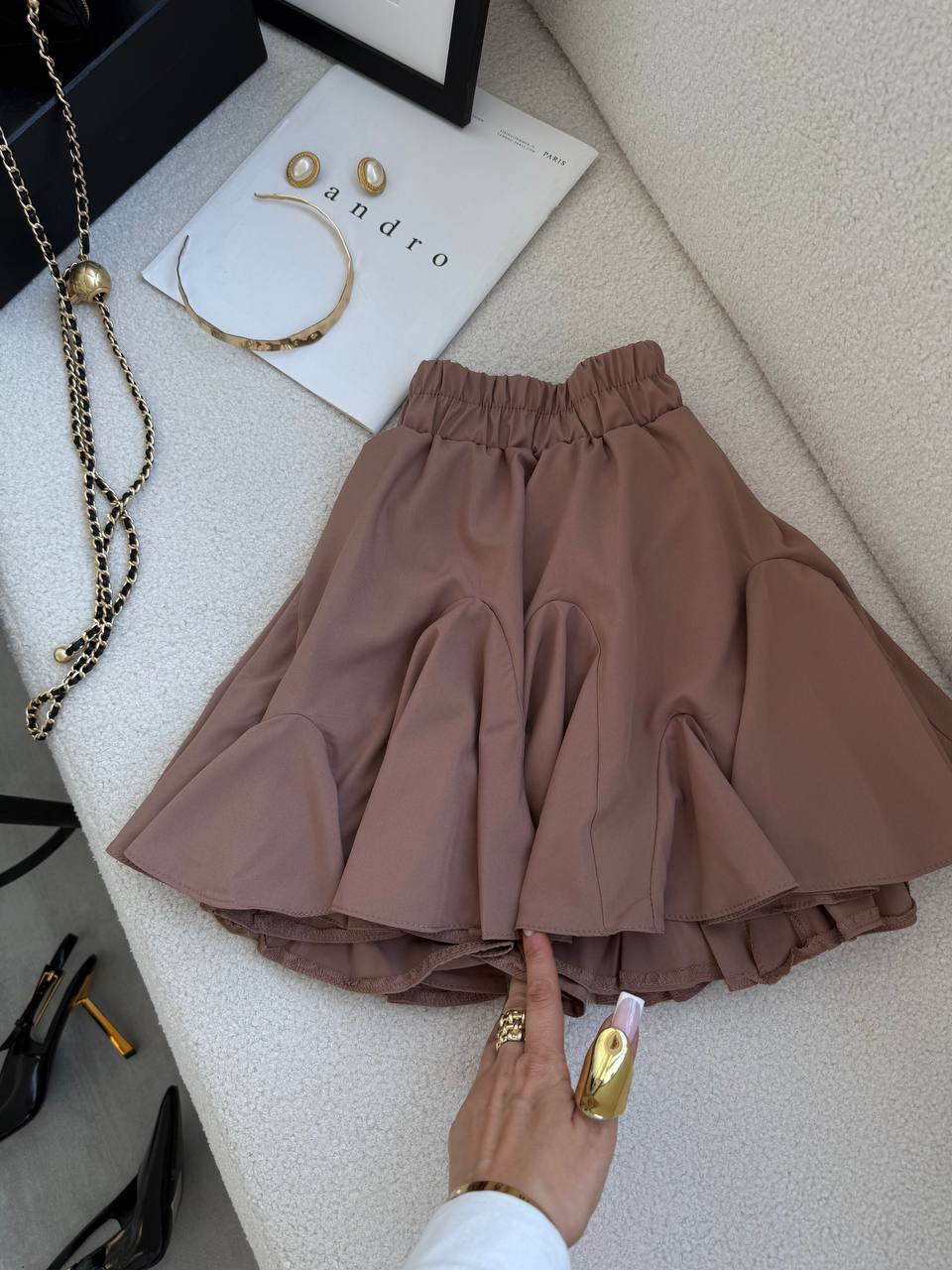 Šis sijonas su šortukais– tobulas pasirinkimas vasarai! Minkštas, lengvai krentantis audinys ir švelni vientisa spalva kuria moterišką, gaivų įvaizdį. Dailūs raukiniai prideda žaismingumo, o elastingas liemuo suteikia maksimalų komfortą. Puikiai tinka tiek prie sportinio, tiek prie elegantiškesnio viršaus.
