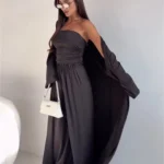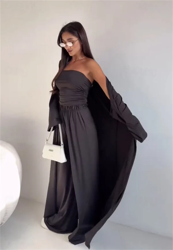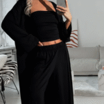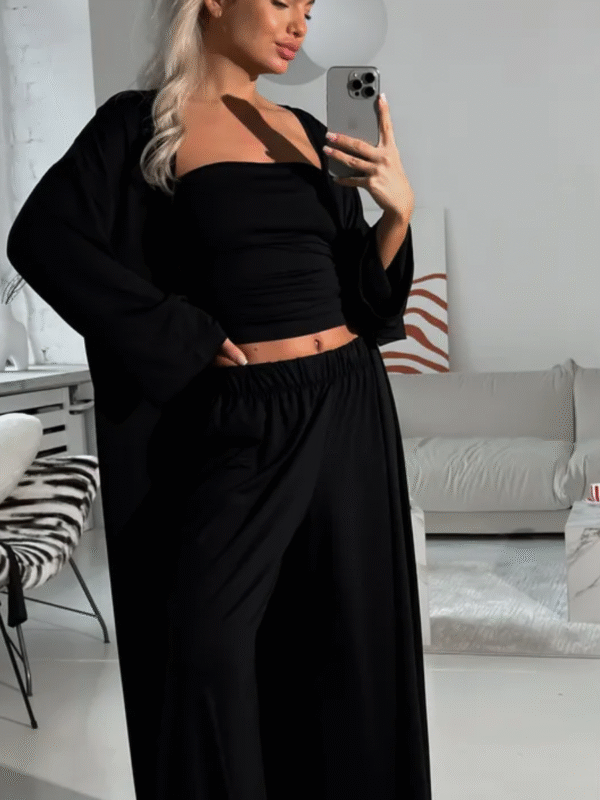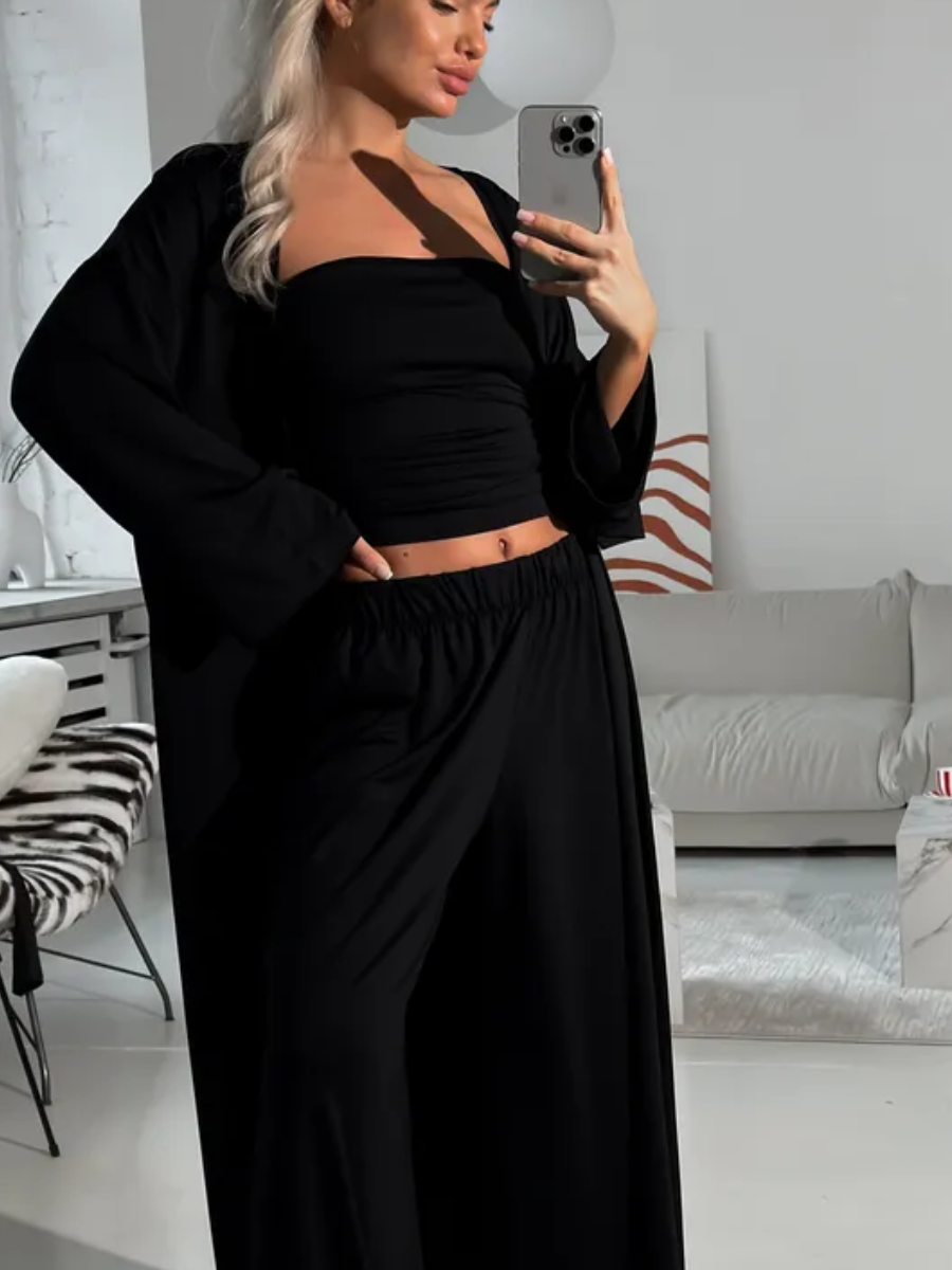 Elegantiškas ir itin patogus trijų dalių komplektas, sudarytas iš ilgo kardigano, plačių kelnių su guma bei prigludusio bandeau tipo topuko. Komplektas siūtas iš švelnaus mikrodiveingo audinio, kuris puikiai krinta, nesiglamžo ir yra malonus odai.