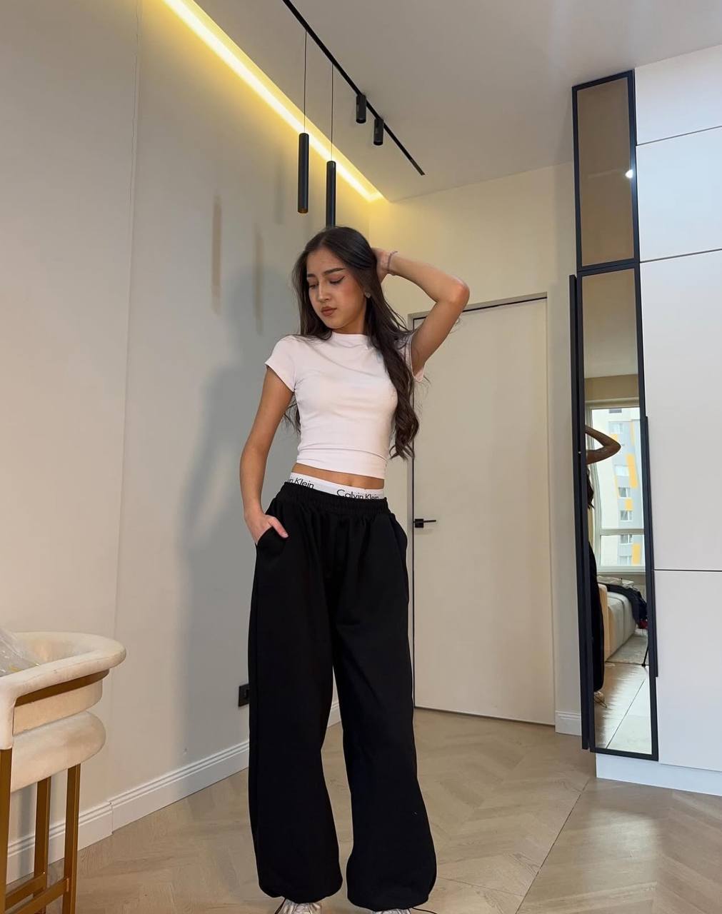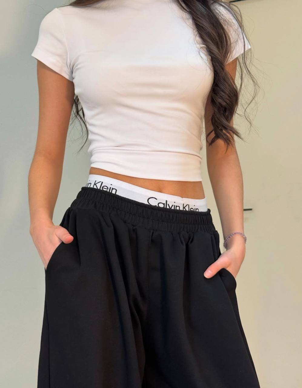 • laisvo kirpimo „palazzo“ tipo kelnės su logotipine guma ir reguliuojamomis apačiomis (galima dėvėti kaip jogger’ius).